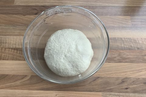 Ist der Teig fertig, muss er erstmal eine Stunde gehen, bis er sein Volumen deutlich vergrößert hat. Dazu kommt er bei mir in eine Schüssel, die ich leer und dann mit Teig gewogen habe (Ja ich weiß. Nerd. 🤓).